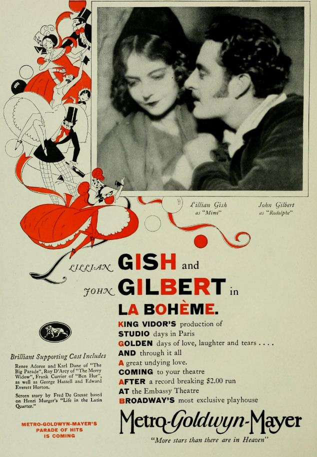 Intensa trasposizione del celebre romanzo Scene della vita di bohème di Henri Murger, a cui s'ispirò Giacomo Puccini per la sua immortale opera lirica. King Vidor, reduce dal successo de La grande parata dell'anno precedente, firma un altro lungometraggio di rara intensità, mai troppo enfatico nei toni e sempre capace di rimanere fedele allo spirito del testo di partenza. Adattamento rigoroso, La bohème colpisce per la delicatezza con cui viene raccontata una storia totalmente tragica e per la capacità di tenere alto il ritmo dall'inizio alla fine. Immortale prova di Lillian Gish che contribuisce alla notevole riuscita complessiva della pellicola; ma anche John Gilbert fa bene il suo dovere.