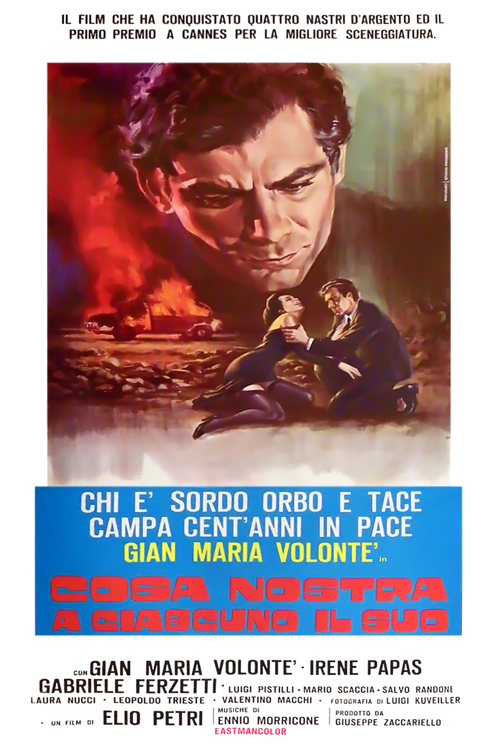 Primo episodio della cosiddetta trilogia della nevrosi (completata da La classe operaia va in paradiso del 1971 e da La proprietà non è più un furto del 1973). Petri e lo sceneggiatore Ugo Pirro raccontano il delirio di onnipotenza di un burocrate consapevole della propria impunibilità in quanto incarnazione dell'ordine costituito. «Qualunque imposizione faccia su di noi, egli è servo della legge, quindi appartiene alla legge e sfugge al giudizio umano»: nella citazione da Kafka che conclude il film sta il senso di Indagine su un cittadino al di sopra di ogni sospetto, audace ritratto dell'arroganza del potere e della fragilità psicologica di chi è chiamato a garantire l'ordine, incerto tra pulsioni autoritarie («La repressione è civiltà» scandisce il protagonista in una celeberrima scena) e la necessità di persuadersi delle proprie ragioni, tra la cinica spavalderia dell'intoccabile e un infantile bisogno di attenzioni. Il funzionario di polizia senza nome cui Volonté presta il volto è uno schizofrenico esibizionista che manifesta tutta la sua sfrontatezza, compensando con la propria feroce superbia di facciata un profondo senso di frustrazione. La sua virilità impomatata e fittizia è la maschera con cui tenta di nascondere l'inadeguatezza sessuale di cui viene accusato dalla sua amante mentre l'insolenza con cui tratta sottoposti, colleghi e civili è un modo per esercitare un'autorità che sente monca e limitata e per sfogare le proprie repressioni (sessuali, culturali e di classe). Senza cedere alle facilonerie di un cinema didattico e schematicamente ideologico, Petri utilizza uno stile barocco e straniante, in cui l'onirismo si fonde con il grottesco, i piani narrativi si confondono e lo spettatore è costantemente spiazzato e stimolato da un'opera complessa e seducente, umoristica e al contempo tragica. Straordinaria la prova di Gian Maria Volonté che con questo film diede ulteriore prova del suo talento eclettico e divenne a tutti gli effetti una star internazionale. Fondamentale il contributo dell'indimenticabile partitura di Ennio Morricone. Oscar come miglior film straniero nel 1971 e Premio speciale della giuria al Festival di Cannes dell'anno precedente.