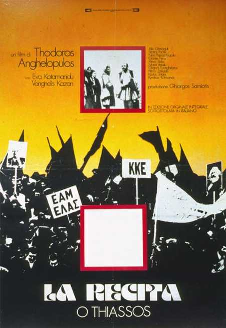 Film di ampio respiro e con ambizioni al limite dell'epico, La recita si configura tanto nel contenuto quanto nella forma come una delle vette del cinema di Angelopoulos: l'opera dove tutte le sperimentazioni delle sue pellicole precedenti giungono a piena maturazione. Tempo, spazio e racconto si fondono in un complesso di rimandi trasversali che partono dal Mito (gli attori della compagni ricalcano la trilogia tragica eschiliana dell'Orestea) fino a divenire Storia (la dittatura, l'invasione italiana, il nazismo, la guerra civile, le elezioni), attraverso una forma-cinema che ne rivoluziona il rapporto. Se lo spazio è considerato come quasi immutabile, congelato al presente della sua ripresa, il tempo si identifica con il movimento della macchina da presa, trasformandosi in pura forma: il piano-sequenza, il carrello o la celeberrima panoramica a 360° divengono l'applicazione privilegiata di questo principio. I personaggi principali del film, invece, fungono da metafora della Grecia stessa, configurandosi contemporaneamente come Mito, come testimoni della Storia e come Storia medesima (in qualità di tipi delle vicende principali della Storia ellenica), in un rimando liquido continuo che abbatte ogni confine spazio-temporale. Questa rivoluzione formale e contenutistica, unita alla straordinaria capacità lirico-simbolica del regista greco, porta la pellicola nell'Olimpo del cinema degli anni Settanta: è un'opera mastodontica (non solo nella durata) che richiede un notevole impegno per apprezzarne tutte le complesse stratificazioni narrative e stilistiche. Premio FIPRESCI al Festival di Cannes.
